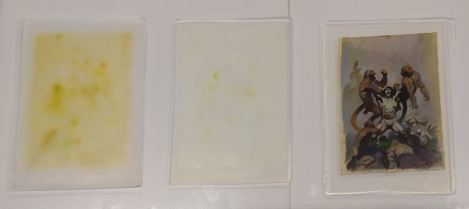 The example, a sketch for a comic book by Frank Frazetta, was cleaned with this method. After the treatment, there were some shadows of the original stains, but the overall appearance of the artwork showed quite an improvement.