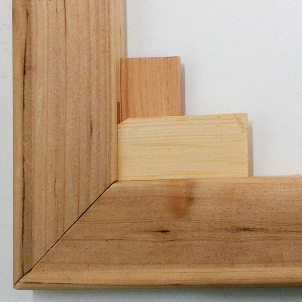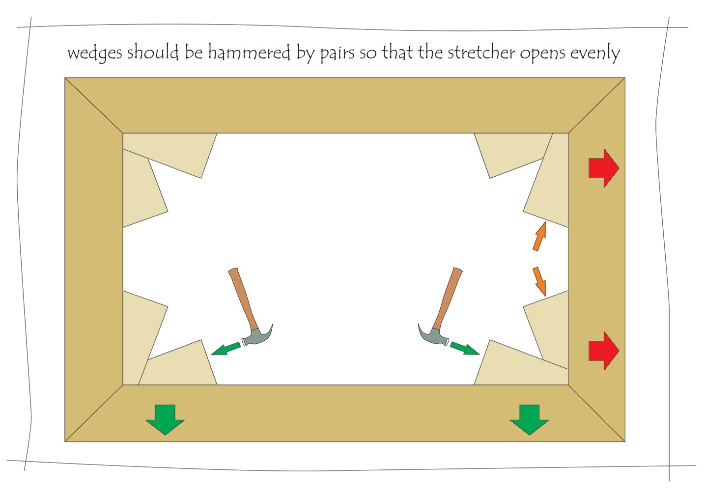 The stretcher keys are the thin, triangular wooden wedges that are hammered into the slots located at the inner corners of the stretchers, in order to tighten the canvas by expanding or opening the stretcher.