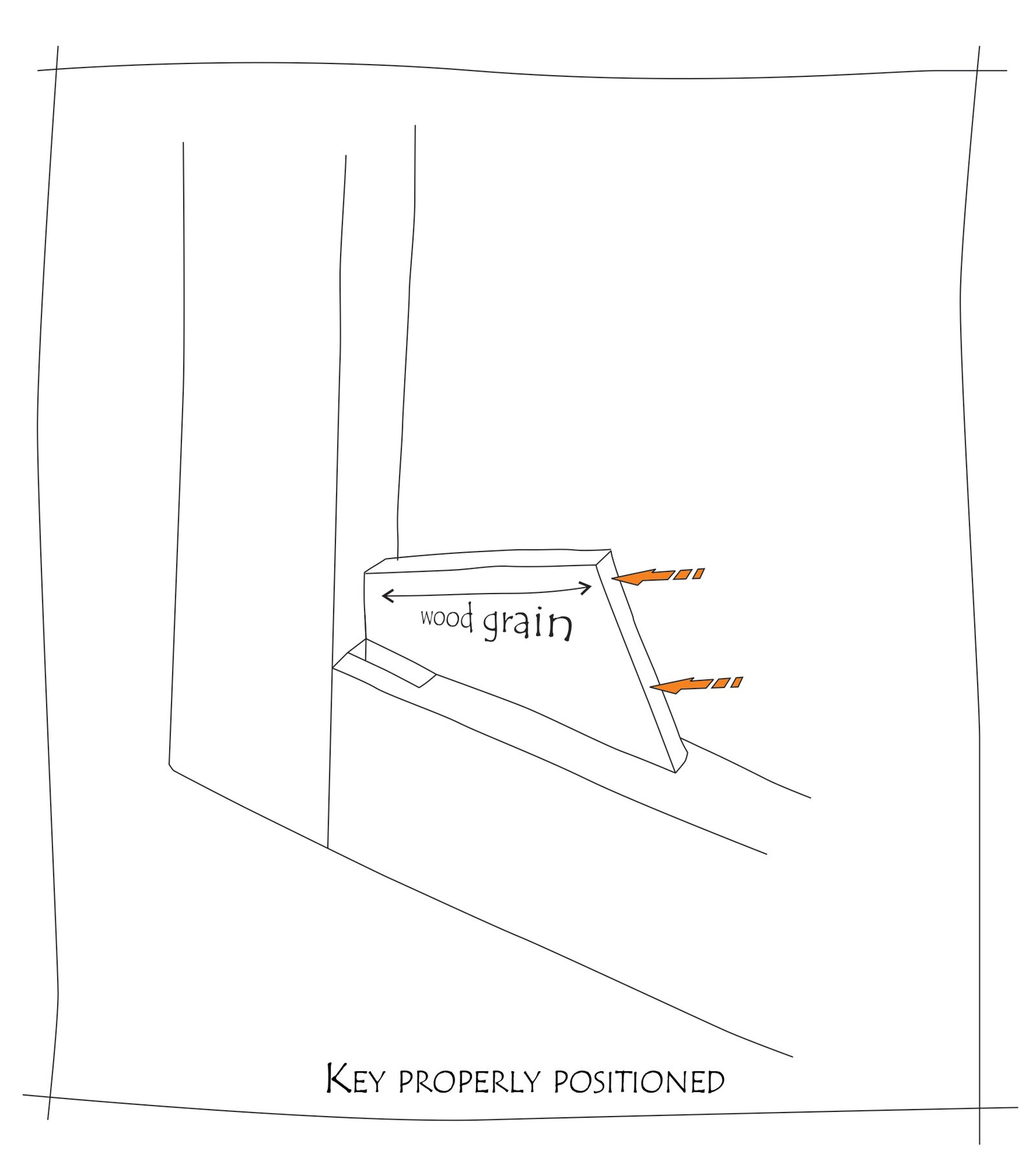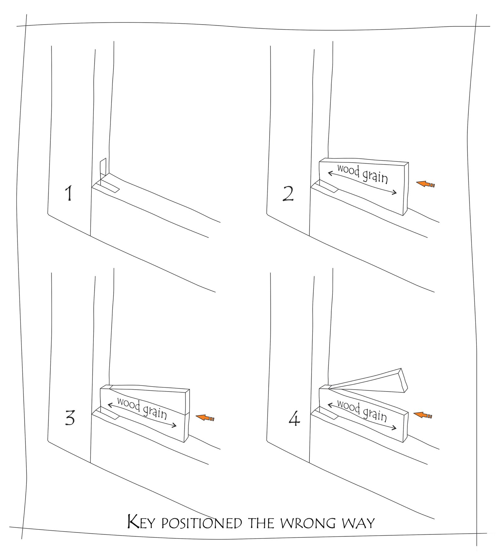 Figs. 3 and 5 illustrate the most frequent way they are positioned,  but this is not the proper way. If placed this way, the grain of the wood offers a certain resistance to get into its slot and can result in the key split open in the direction of the grain. However, in Figs. 4 and 6, The grain of the wood wedge is positioned so as to favor the sliding of the key into the slot and the risk of the wedge splitting open diminishes substantially.